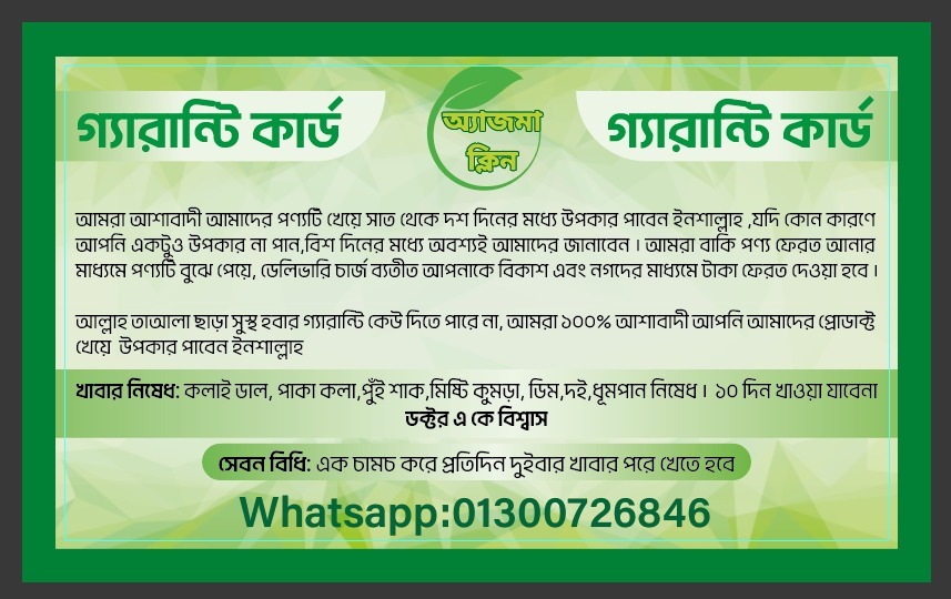 কোল্ড এবং ডাস্ট এলার্জি থেকে স্থায়ী সমাধান পেতে আপনাদের জন্য নিয়ে এসেছি অ্যাজমা ক্লিন, অ্যাজমা ক্লিন ব্যবহার করলে ইনহেলার বা নেবুলাইজার এবং কোন প্রকার ট্যাবলেট যেমন মোনাস 10 মনটিয়া আর প্রয়োজন হবে না ইনশাল্লাহ